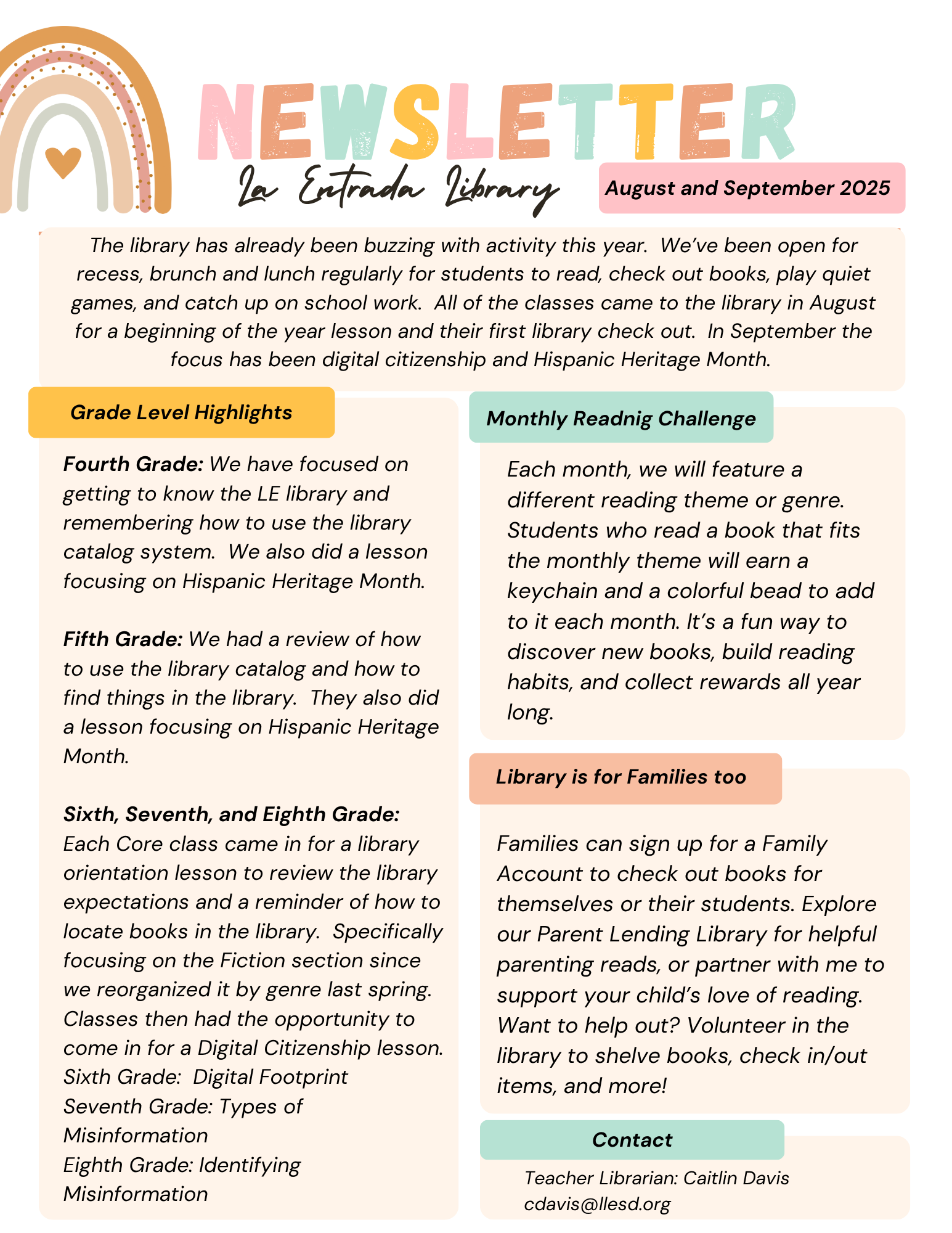 I became the La Entrada librarian in the 2016-2017 school year and I absolutley love my job. Prior to joining the LE staff, I was a teacher and instructional coach in Sunnyvale. I spent 16 years as a classroom teacher before becoming a librarian.